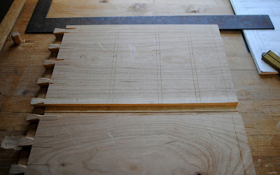 In a spice chest the drawers are basically supported on a series of shelves. One of my first worries was getting the dados laid out correctly on both boards so the shelves would be even across the carcass. I spent a lot of time getting the shelf spacing measurements laid out on the first board and then cutting the lines in good and deep with a marking knife. The problem came in transferring those lines to the next board accurately.